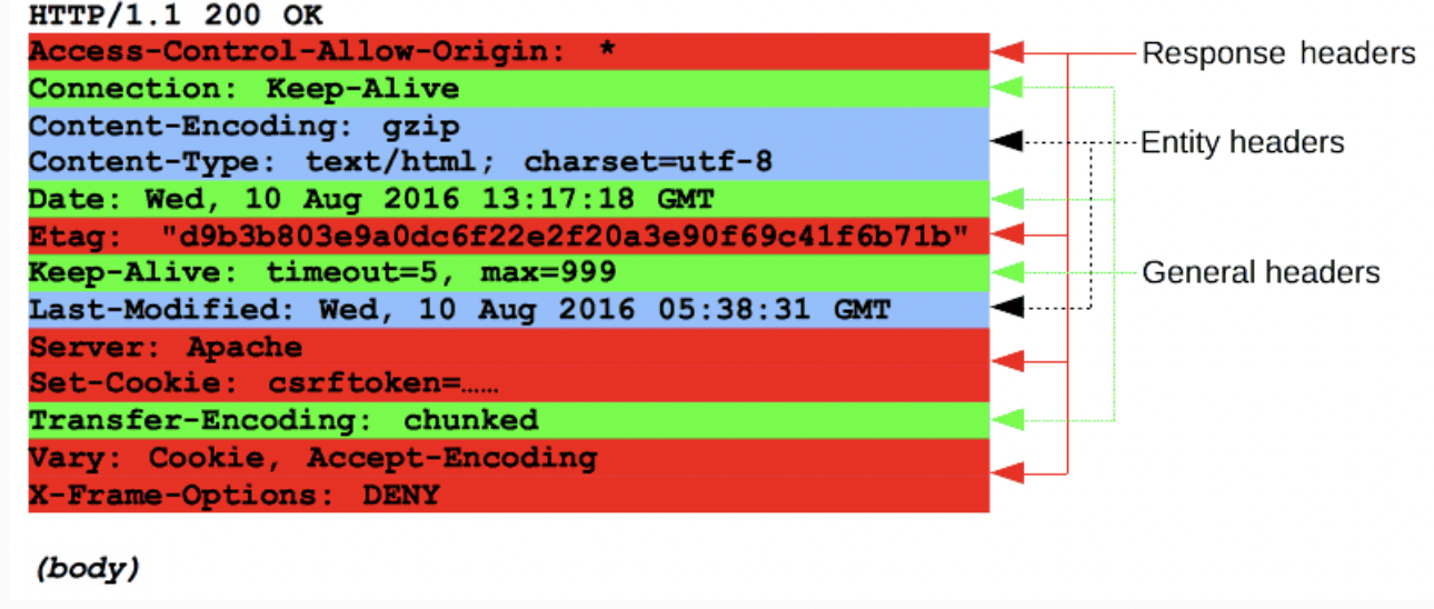 응답에 들어가는 HTTP headers는 요청 헤더와 동일한 구조를 가지고 있다. 대소문자 구분 없는 문자열과 콜론(:), 값을 입력한다다. 값은 헤더에 따라 다르다. 요청의 헤더와 마찬가지로 몇 그룹으로 나눌 수 있다.