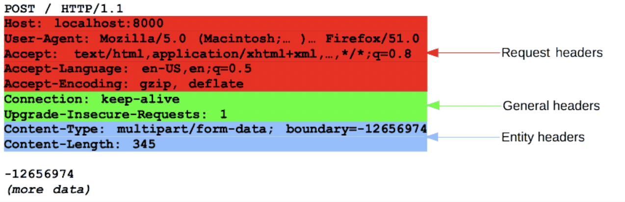 - Request headers : User-Agent, Accept-Type, Accept-Language과 같은 헤더는 요청을 보다 구체화한다. Referer처럼 컨텍스트를 제공하거나 If-None과 같이 조건에 따라 제약을 추가할 수 있다.